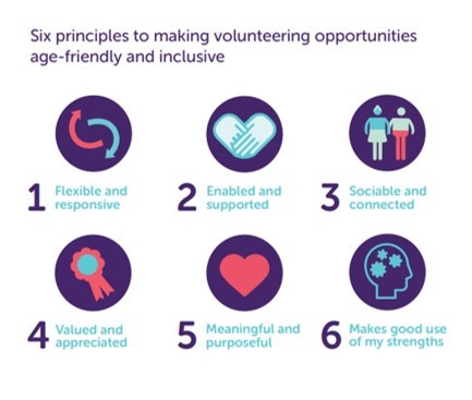 The Centre for Ageing Better produced the 6 principles to age friendly and inclusive volunteering pictured above.